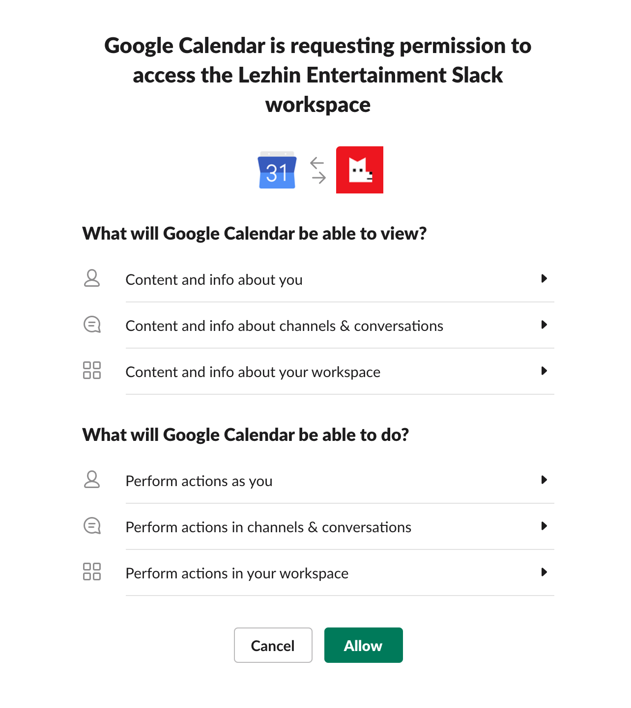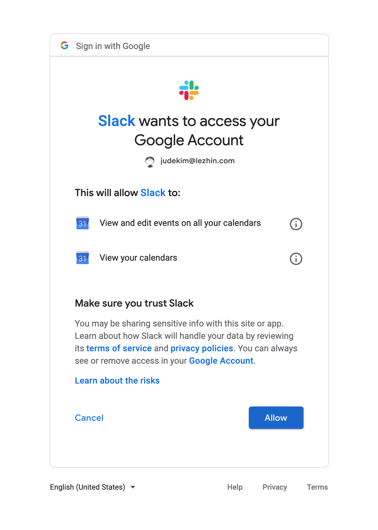 Google Calendar와 Slack 간의 연동을 위한 권한을 허용합니다.