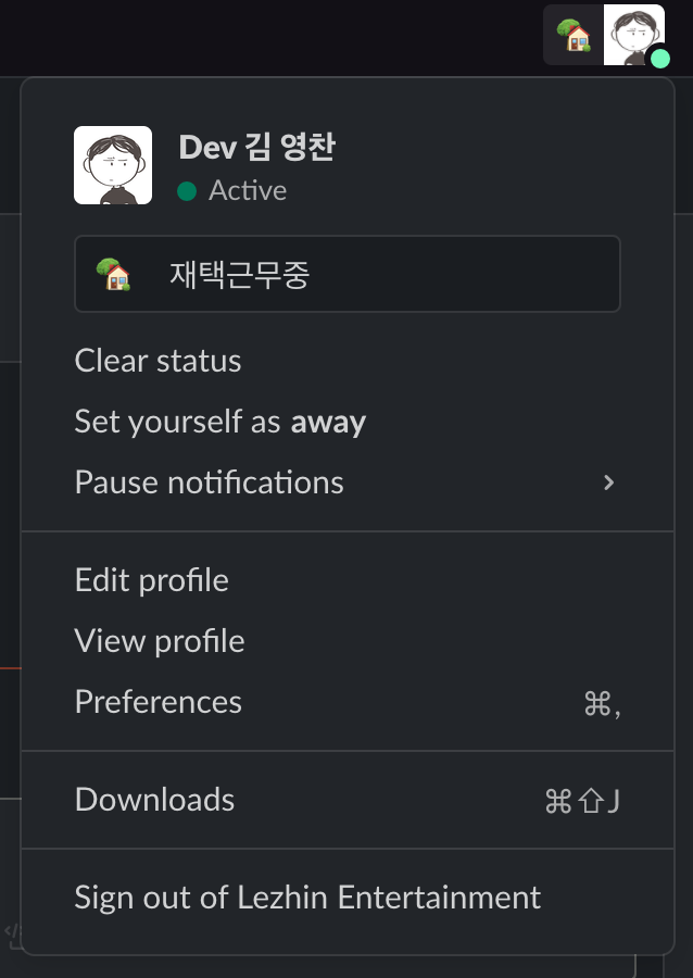 user profile 버튼 좌측의 현재 재택근무 중으로 설정되어 있는 아이콘 표시 버튼을 클릭하거나 profile 눌러서 나온 재택근무 중 영역을 클릭하면 상태를 변경 가능합니다.