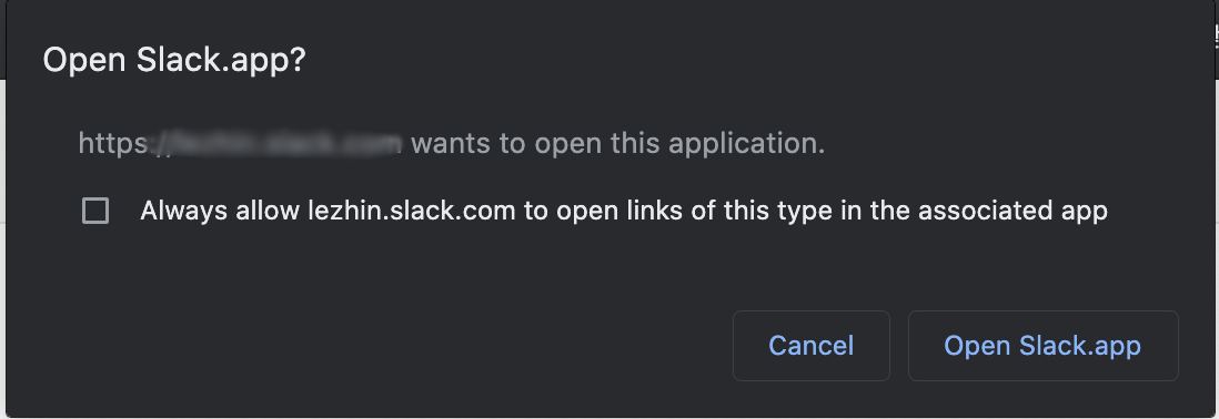 이제 App을 실행하기 위해 물어봅니다. Open Slack.app을 눌러줍니다.