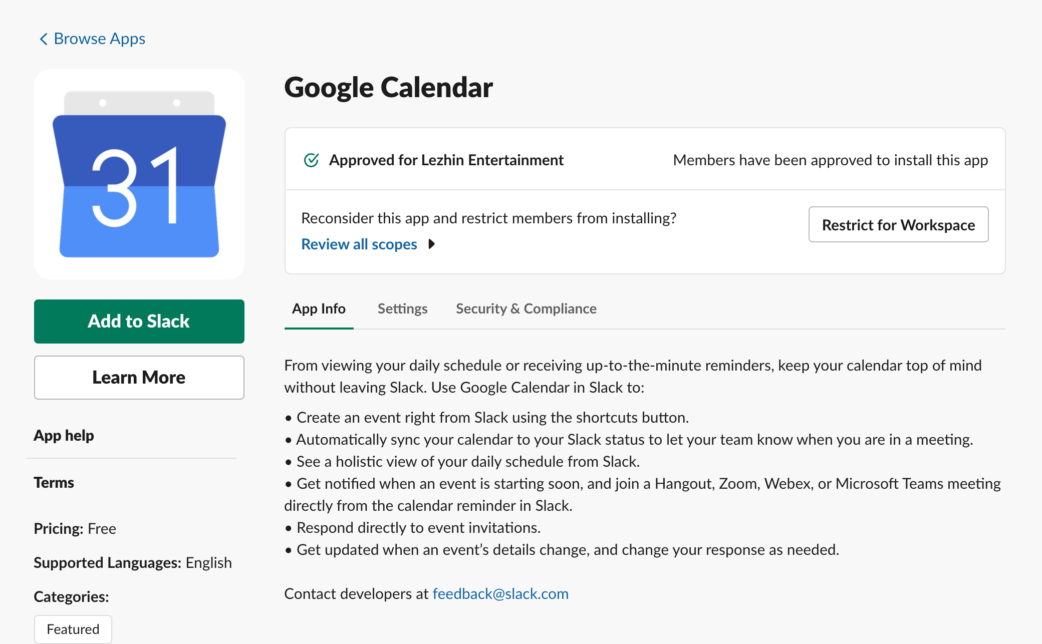 시작하기 전에 먼저 우리는 Google Calendar를 사용하고 있으므로 이 App을 설치하여 Slack과 연동해줍니다. ( 이미 되어 있음 )