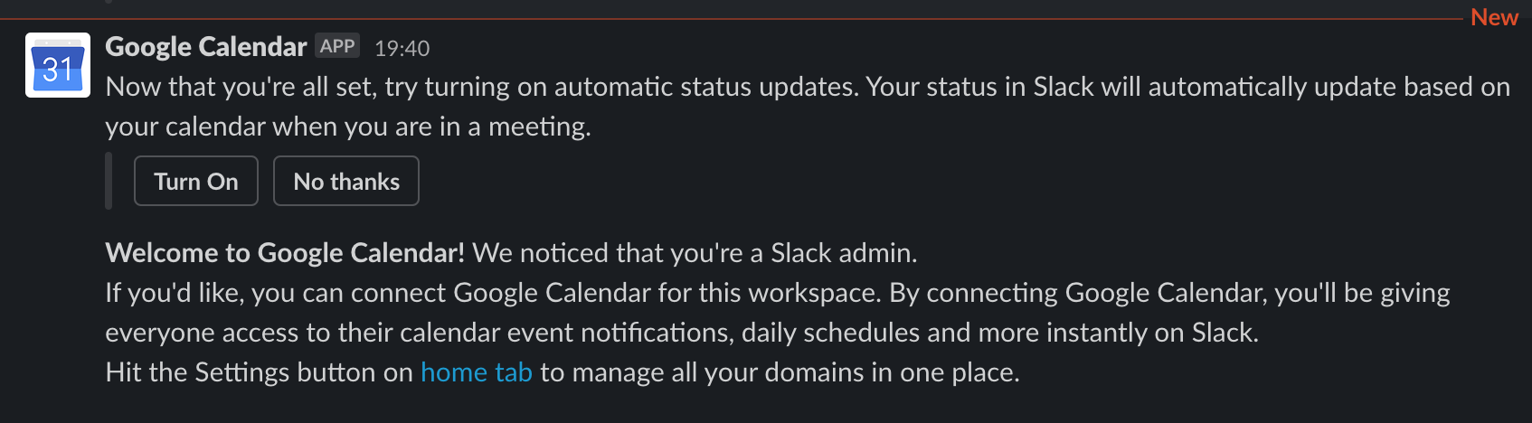 Slack에 Google Calendar Channel 이 생겼고 다음과 같이 물어봅니다.