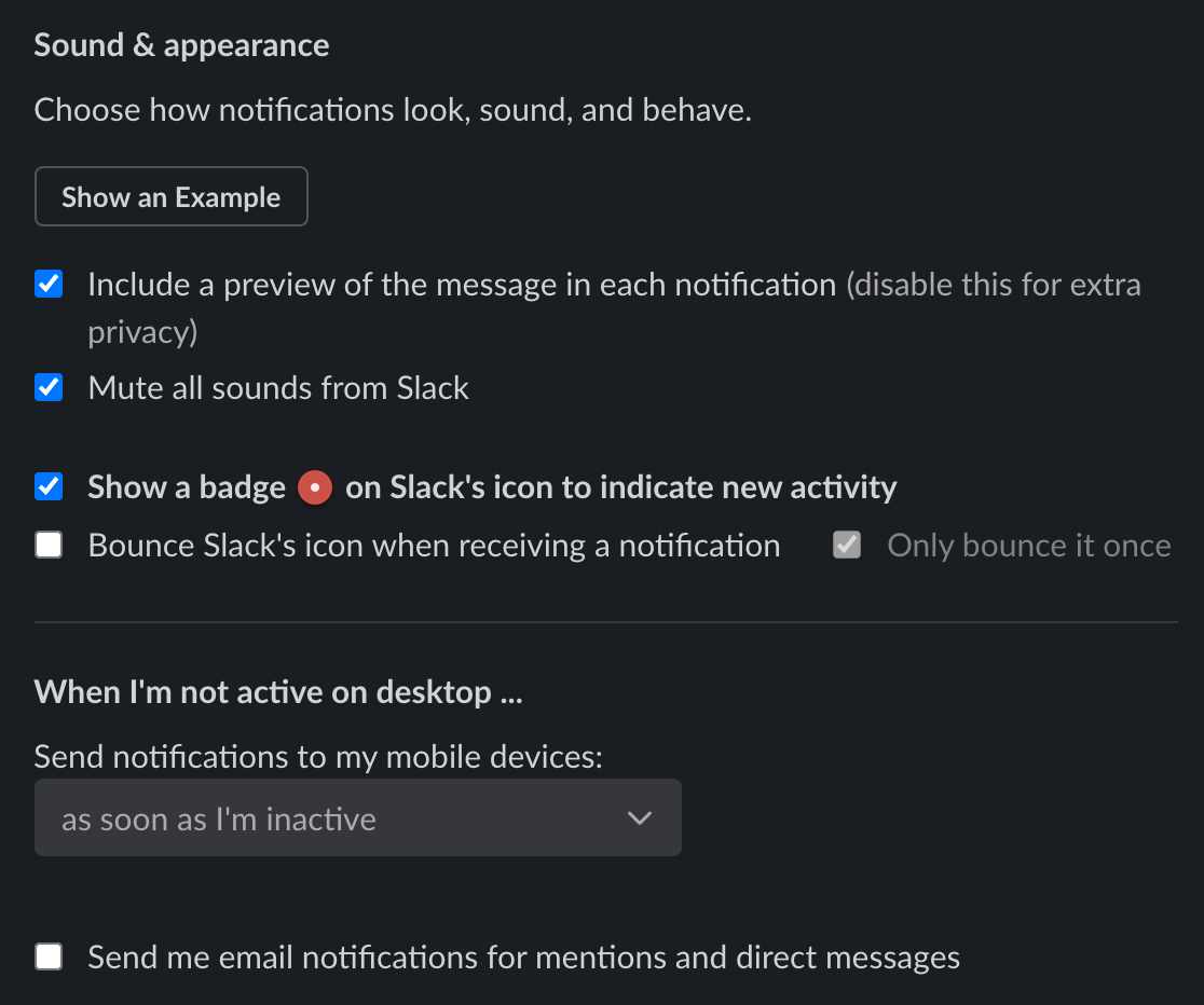 새로운 Notification을 받았을 때 슬랙아이콘을 바운스 할 것인지? 새로운 메시지가 계속 들어올 때 그 바운스를 한번만 할 것인지?Desktop ( PC )에서 Active 상태가 아닐때 모바일 device로 노티를 보낼 것인지?