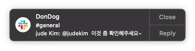 PC의 Slack App에서는 사이드 바의 채널에 숫자로 1이라고 배지가 나타나고, 우측 Mac OS의 우측화면에서 Notification 바가 뜰 것이다.