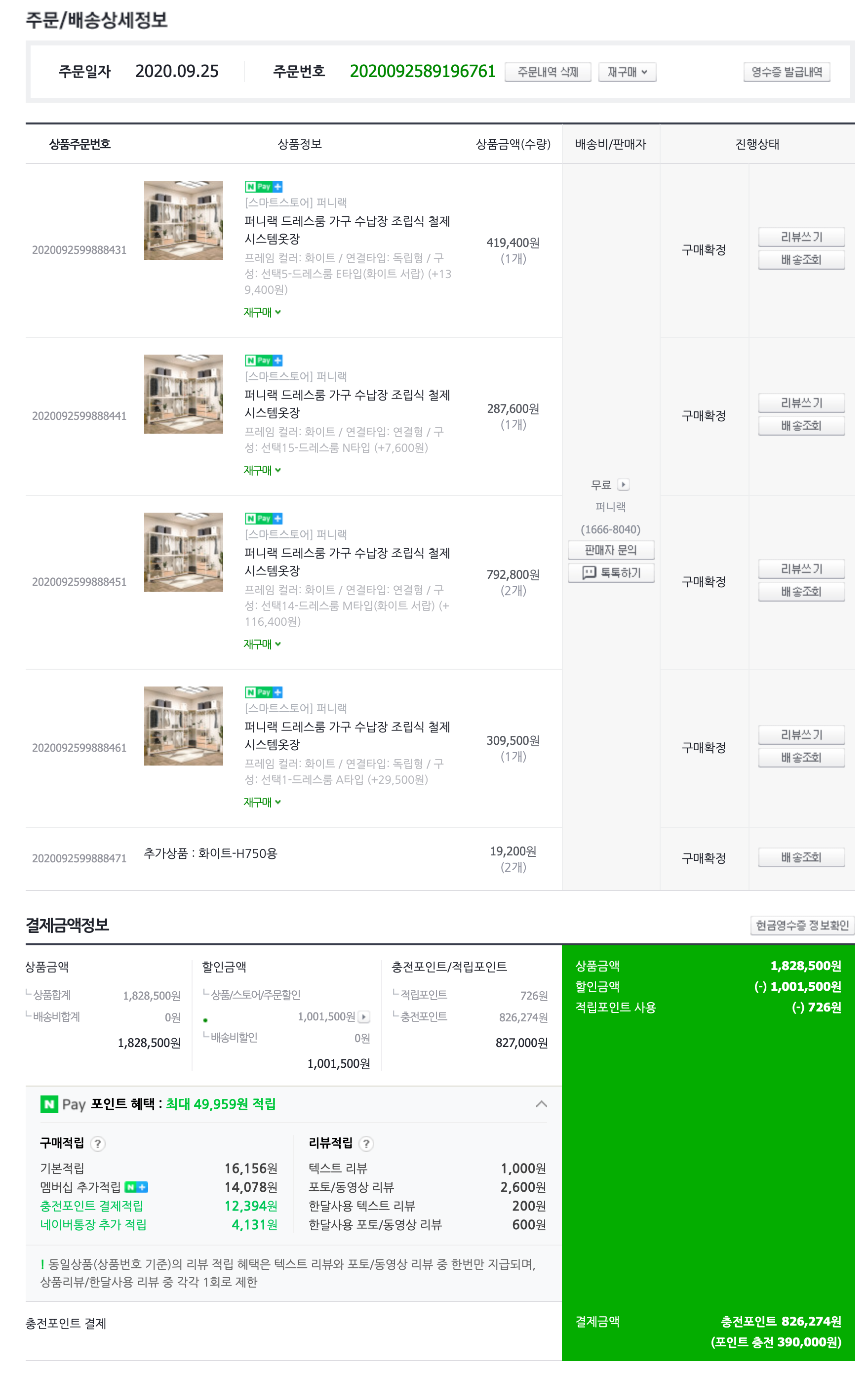 취소를 확인한 후 안방까지 800mm x 3개, 400mm x 1개, 은우방 800mm x 1개 이렇게 주문을 했다. 금액은 80만 원 초반대.. 한샘 2개 금액으로 선방(?)했다. ( 82만 7천원 )