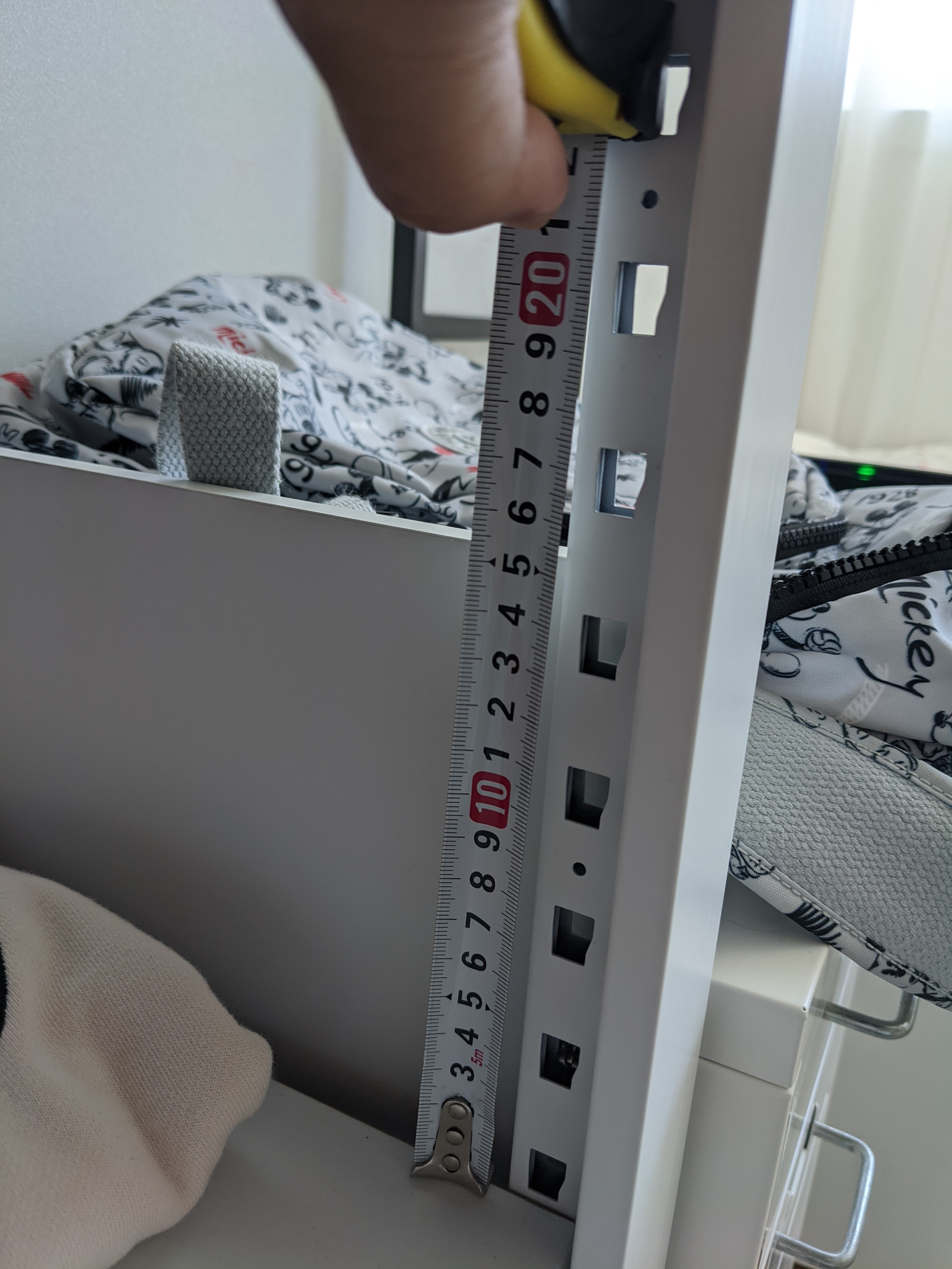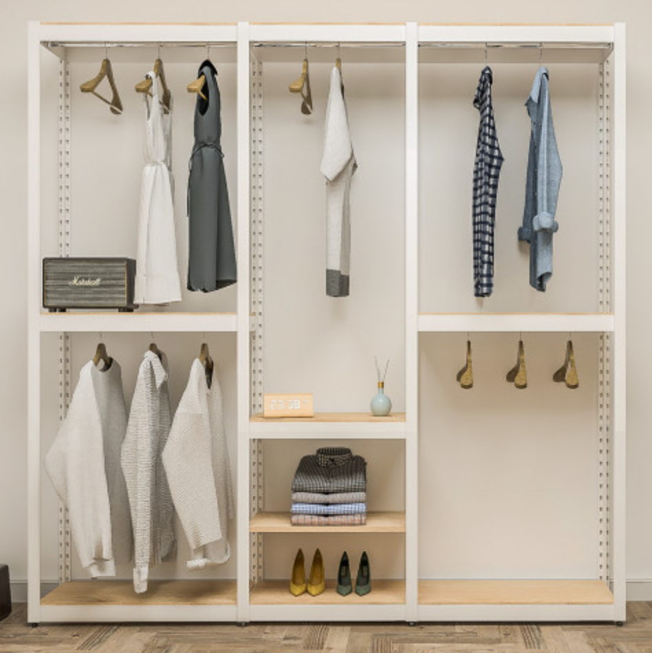 구성이 어떤가에 따라 다를 수 있지만, 3단 선반 3개, 상하 행거로 하나, 6단 400mm 폭으로 하나에 추가적으로 은우방에는 750mm로 양쪽 측판(서랍 양옆을 가리기 위해)을 추가했다.