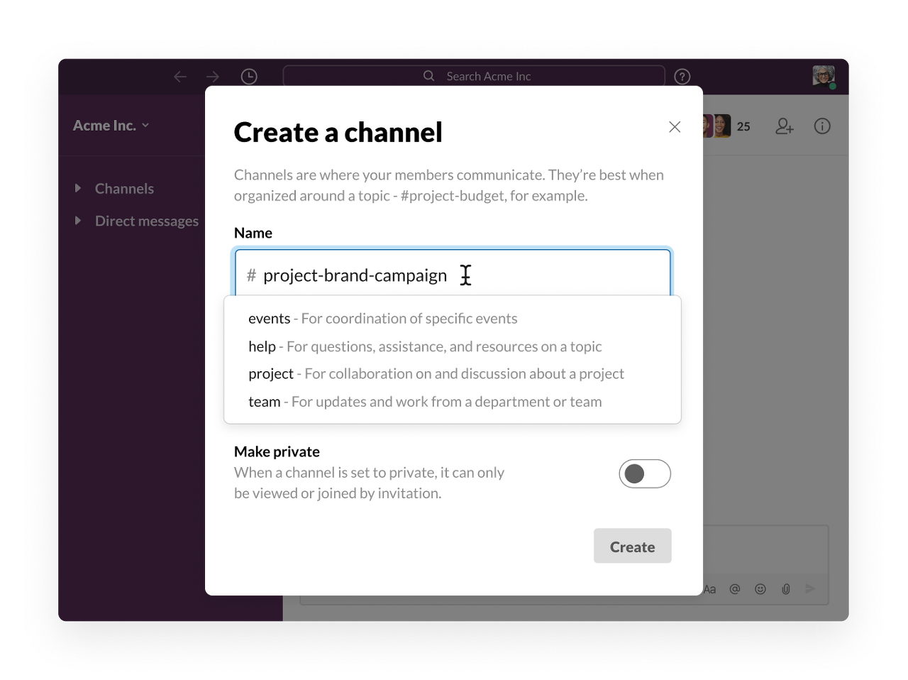 채널을 사용하여 특정 주제와 관련한 대화와 작업을 통합합니다. 다른 사람들이 자신의 작업과 관련된 채널을 찾고 가입하는 것을 쉽게 하기 위해 채널 이름 접두사를 사용하기 시작했습니다. 잘 정리된 룰로 채널을 찾는다면, 그 후 적절한 사람들과 정보가 함께 모이면서 채널은 그 역할을 잘 수행하게 될 것입니다.